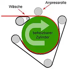 Паровое устройство для машинного глажения плоского, в том числе крупного белья (простыни, пододеяльники, наволочки, полотенца, шторы, скатерти, нательное бельё без конструктивных крупных твёрдых элементов (металлических, пластмассовых) и т.д.)[8][9]. Каландр является неотъемлемой частью любой прачечной с большим оборотом вещей. Проходя между горячим валом и натяжными ремнями-транспортёрами, бельё проходит процедуру глажки и сушки одновременно, эта процедура существенно уменьшает время, которое могло быть потрачено на ручную глажку. Нагрев вала происходит перегретым паром проходящим внутри него под давлением. Позволяет гладить бельё до 50 % влажности, заменяя собой также сушильные аппараты.