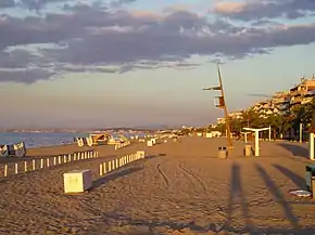Большой протяжённости пляж покрыт мелким песком, лёгкие барханы которого полого уходят в море. На расстоянии 25—30 м от берега глубина моря начинает достигать человеческий рост. Пляж постоянно очищается местными коммунальными службами. Вдоль пляжа красивый променад с бесчисленным количеством кафе и ресторанов.[3]