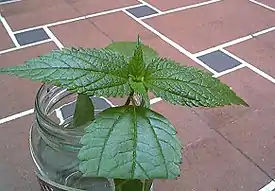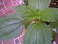 Сильно разветвлённый кустарник высотой до 1—1,5 м с зазубренными по краям листьями, треугольно-овальной формы, 2—6,5 см длиной.