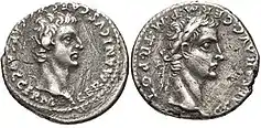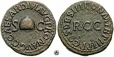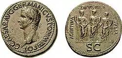 | Бронзовый квадранс, самая мелкая монета в римском обиходе (1/1600 ауреуса), выпущена в память об отмене налога с продаж, 38 год | Орихалковый (латунный) сестерций с портретом Калигулы и изображениями трёх его сестёр, 37-38 годы | Серебряный денарий с портретами Германика и Калигулы в лавровом венке, 37-38 годы | Золотой ауреус с портретами Калигулы в лавровом венке и Германика, 40 год |