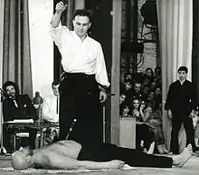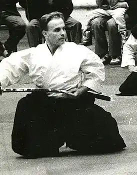 ![]() П. Калинин в 1989 году с показательными выступлении в команде «Сэкай» на чемпионате по каратэ | |