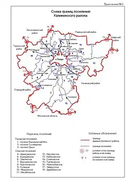 В Калининский район, с точки зрения административно-территориального устройства области, входят 18 поселений[29][30].