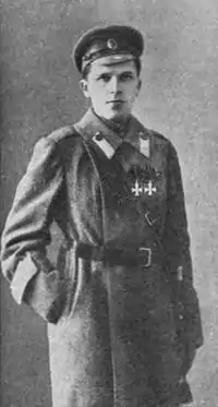 С началом Первой мировой войны поступил в действующую армию добровольцем, на правах вольноопределяющегося. Впоследствии заслужил чин штабс-капитана и был награждён Георгиевскими крестами 4-й и 3-й степени за отличие в боях.