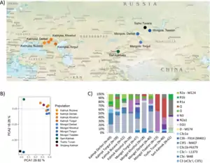 По данным популяционной генетики у калмыков на первом месте по распространённости находится Y-хромосомная гаплогруппа C3c1-M77 (C2b1a2a) — 38,7 %. Далее следуют: C3d-M407 или C2c1a1a1 (10,8 %), N1c-Tat или N1a1 (10,1 %), R2a-M214 (7,7 %), O3-M312 (6,8 %), C3*-M217 или C2 (6,6 %), O2-P31 или O1b (5,2 %), R1a1a-M17 (3,3 %), J2a-P37.2 (1,6 %), N1b-P43 или N1a2b (1,4 %), R1b1b1-M73 (1,4 %), D-M174 (1,2 %), Q1a1a-M120 (0,9 %)[21].