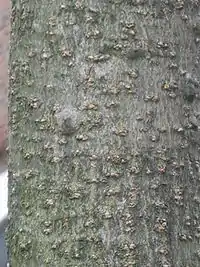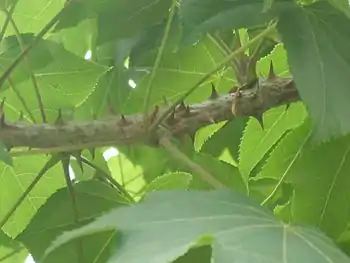 Кора молодых деревьев гладкая, с крупными шипами до 2 см, кора старых деревьев чёрная, с глубокими трещинами.