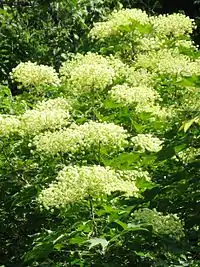 Бело-жёлтые цветки собраны в большие соцветия на концах побегов. Цветение начинается в августе, отмечается не ежегодно, а лишь в благоприятные годы.