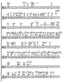 - Изменение формы текста песнопений при помощи повтора и вставки слогов, образованных с использованием буквы ν (в форме «или»), анаграмаматизм[2] или анаподизм[3] (инверсия порядка слов или фраз текста), вставка указаний о способах исполнения (к примеру, λέγε — говори или πάλιν — снова, то есть повторить ещё раз).
