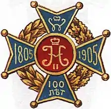 Утверждён 8.7.1911 г. Золотой крест, покрытый голубой эмалью, с золотыми ободком и шариками. На концах креста изображены золотом юбилейные даты: «1805-1905» и «100 лет», а также вензель Императора Германского Вильгельма I, бывшего Шефом полка с 1818 по 1888 г. и имя которого полк носил вплоть до 1914 г. В центре на красной прозрачной эмали золотой накладной вензель Императора Николая II. Знак лежит на золотом венке из лавровых и дубовых ветвей.