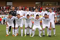 ![]() Молодёжная сборная Греции перед товарищеским матчем со сборной Австрии 5 сентября 2011 года, Никос Калцас — крайний слева в нижнем ряду | |||||||||||||||||||||||||||||||