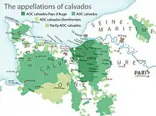 Место изготовления кальвадоса ограничивается французскими департаментами Кальвадос, Манш, Орн и частями департаментов Эр, Майенн, Сарт и Эр и Луар. Более жёсткие правила «Appellation Calvados Pays d’Auge contrôlée» ограничивают область изготовления напитка восточной оконечностью департамента Кальвадос и рядом примыкающих областей.