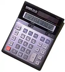 - Бухгалтерские калькуляторы ориентированы на профессиональные арифметические расчёты с денежными суммами, то есть на применение бухгалтерами и кассирами. Обычно выпускаются в настольном исполнении, имеют корпус с крупными клавишами и дисплеем большого размера. Клавиатура может дополнительно содержать клавиши для более удобного ввода денежных сумм (кнопки «00» и «000»), поддерживается большее, чем в инженерных калькуляторах, число знаков (индикатор вмещает до 12—15 цифр), режимы работы с фиксированным количеством разрядов дробной части и автоматическое округление). Обычно имеют не более одного-двух регистров памяти, но поддерживают арифметические операции с записью в регистр и вычисление процентов. Как правило, не имеют на клавиатуре кнопок двойного/тройного назначения. Некоторые модели реализуют арифметическую логику: операции сложения и вычитания нажимаются после ввода числа, но функции умножения и деления производятся в обычной форме.
