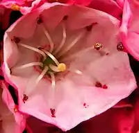 ![]() Кальмия широколистная (Kalmia latifolia), цветок крупным планом. Видны тычинки, упёршиеся своей верхней частью в карманообразные отгибы лепестков |