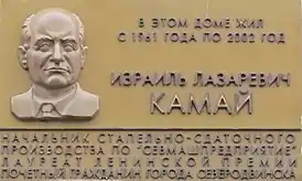 ![]() Мемориальная доска на доме № 52 по улице Советской в городе Северодвинске; где жил И. Л. Камай. | |
