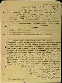 | Представлялся к награде | ![]() Наградной лист на представление к ордену «Красное знамя» от 27 июня 1944 года. |