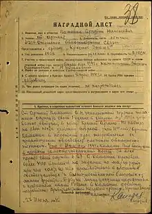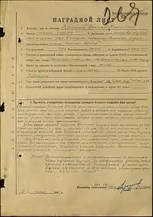 ![]() Наградной лист на представление к ордену «Отечественная война II степени» от 1944 года. |