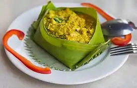 | Amok trey (អាម៉ុកត្រី) | Наверное, самое известное блюдо Камбоджи среди посетителей; похожие блюда есть и в соседних странах. Филе пресноводной рыбы (обычно змееголов или меконгский сом) покрывают ароматным kroeung (толченый лук-шалот, лимонная трава, чеснок, кафрский лайм), жареным измельченным арахисом, кокосовым молоком и яйцом, а затем заворачивают в банановые листья и готовят на пару до тех пор, пока оно не станет похожим на мусс. В отличие от тайской, лаосской и малайзийской версий одного и того же блюда, оно не должно быть пряным, а скорее душистым, пикантным и ароматным.[13] |