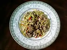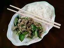 | Bo luc lac (ឡុកឡាក់) | Это блюдо из говядины франко-индокитайского происхождения. Он состоит из жареной маринованной говядины, нарезанной кубиками, смешанной со свежим красным луком, подаётся на подушке из салата, огурцов и помидоров и заправлено соусом, состоящим из сока лайма,[11] морской солью и черным кампотским перцем (tek merec).[12] Региональные варианты включают lok lak Americain, которая встречается в меню бистро в Пномпене, отличается добавлением чипсов (а не риса) и жареного яйца. |