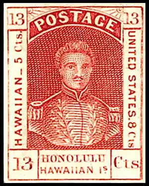 Ранняя марка Королевства Гавайи (1853): Камеамеа III (Sc #6). Номинал (13 центов), согласно надписям, включал оплату гавайского почтового сбора в 5 центов и сбора в 8 центов за пересылку по США («Postage / Hawaiian — 5 Cts. / United States. 8 Cts»)