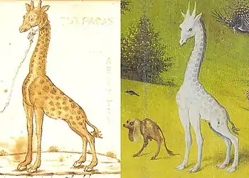 Древнеримские авторы описывали камелопарда как длинношеее животное с длинными передними и более короткими задними ногами, телосложением напоминающее верблюда, а пятнами — леопарда.[1] В Западной Европе камелопарда идентифицировали как жирафа не позднее XVI века,[2] слова «камилопардал» и «камелопард» фиксируются в русском со значением «жираф» в XVIII–XIX вв.[3][4], а внешность реального жирафа была в своё время[когда?] избрана в геральдике для передачи мифического камелопарда.
