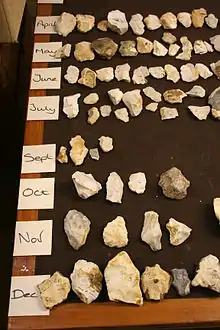 - Сырьё: массивное (валуны, желваки, гальки, плитки, целые куски породы), мелкое (мелкие куски, мелкие плитки, галечки, плоские галечки).