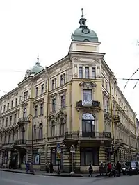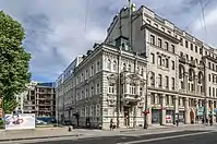 7831330000 — доходные дома Г. А. Александрова, 1905—1906, арх. Д. А. Крыжановский при участии П. М. Мульханова. Под руководством Мульханова было расширено и реконструировано (1898, 1912) здание театра («Ледяной дворец») в саду «Аквариум» во дворе этих домов. Здесь 4 мая 1896 года состоялся первый в России киносеанс — показ фильмов братьев Люмьер. Кроме того, в 1903-м Мульханов построил доходный дом в правой части двора дома № 12, а также здание Петербургского центрального рынка Г. А. Александрова (1903—1904; железный крытый рынок — 1908). Эти здания были перестроены в 1920-х, чтобы приспособить их под нужды киностудии: с 1924 года в помещениях театра расположился «Севзапкино», современный «Ленфильм». В честь столетия первого киносеанса в 1996 году на доме № 10 была установлена мраморная мемориальная доска (арх. В. И. Новосадок)[17]. - Каменноостровский проспект, 14