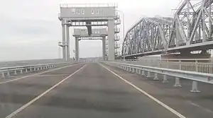 Новый вертикально-подъёмный автомобильный мост был введён в эксплуатацию 30 декабря 2019 года[7][8][9]. По своей конструкции он аналогичен мосту, сооружённому в 2009 году через реку Дон в станице Казанской Ростовской области. При разведении моста пролётное строение поднимается поступательно в вертикальной плоскости для обеспечения прохода крупногабаритных судов. Для этого служат башни на специальных опорах. На башнях укреплены шкивы, через которые проходят тросы. Тросы соединяют подъёмное пролётное строение с противовесами, которые при раскрывании моста опускаются вниз.