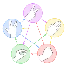 Камень, ножницы, бумага — популярная игра на руках, известная во многих странах мира. Часто используется как способ жеребьёвки для определения очерёдности хода в других играх.