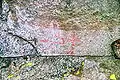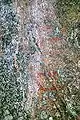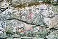 Третья группа находится практически над осыпью, на нижнем краю блока на желтоватой корочке. Здесь можно выделить несколько фрагментов неясных геометрических мотивов, а также группы вертикальных отрезков светло-красного цвета.