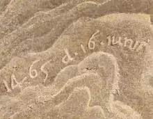 Над дверью написан хоровод путти, которые несут золотую доску с латинской надписью, увековечивающей работу над росписью и прославляющей заказчиков и художников: «Сиятельному Лодовико, второму маркизу Мантуанскому, государю превосходнейшему и в вере непоколебимейшему, и сиятельной Барбаре, его супруге, женщине несравненной славы, их Андреа Мантенья, падуанец, закончил это скромное произведение в их честь в 1474 году».