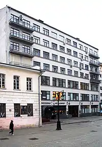 Семиэтажный дом построен в 1929—1930 годах по проекту архитектора С. Е. Чернышёва для рабочего жилищно-строительного кооперативного товарищества (РЖСКТ) «Крестьянская газета» имени Л. Б. Красина. После заселения получил название «Дом писателей» или «Дом писательского кооператива»[56] (реже — «первого писательского кооператива»)[57]. Дом состоит из двух частей, при этом фасадная часть, выходящая на Камергерский переулок, по всей видимости изначально предназначалась под гостиницу: по сторонам от длинного коридора были расположены 2-х комнатные квартиры, оборудованные небольшими кухнями без окон; ванные в квартирах предусмотрены не были, жильцы устанавливали их самостоятельно, перегораживая для этого небольшие прихожие. Другая часть дома стоит во дворе, перпендикулярно примыкая к фасадной части. Здесь расположены 4-х комнатные квартиры с большими кухнями, ванными комнатами и просторными коридорами.[58]