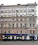 В 1891 году по проекту архитекторов Б. В. Фрейденберга и Э. С. Юдицкого на участке был построен доходный дом для А. Г. Толмачёвой. В доме Толмачёвой находился ресторан «Рояль», магазин Ворониной, магазин военных и гражданских вещей И. Т. Каткова, павильон фотографа Ф. К. Вишневского,[16] магазин Груздева «Садоводство»[17]. В здании был большой зал со сценой, который занимал сначала Железнодорожный клуб, а затем театр «Весёлые маски». В 1914 году в здании были проведены ремонтные работы по проекту архитектора В. С. Кузнецова. В 1920-х годах в доме находилось артистическое кафе «Десятая муза», названное в честь музы кино. В «Десятой музе» собирались кинематографисты, актёры, операторы, художники, подписывались контракты на постановку фильмов.[2] В кафе также проводились общие собрания Всероссийского союза поэтов.[18] Здесь бывали В. В. Маяковский, В. В. Каменский, Д. Д. Бурлюк, В. Я. Брюсов, С. А. Есенин,[2][18] И. Г. Эренбург,[19] А. Б. Мариенгоф[18] и другие. В 1918 году Брюсов написал в кафе импровизацию «Memento mori». В апреле того же года в кафе «Десятая муза» открылось кабаре «Короли экрана среди публики», в котором участвовали актёры Вера Холодная, Владимир Максимов, Вячеслав Висковский, Осип Рунич, Иван Худолеев и другие[20]. В доме жили: дирижёр и профессор Московской консерватории И. В. Гржимали, солистка Большого театра оперная певица М. А. Дейша-Сионицкая, народные артисты СССР Л. М. Леонидов и В. Н. Пашенная. Основная часть доходного дома была разрушена в результате реконструкции Тверской улицы и на её месте в 1937—1940 годах был построен жилой дом по проекту архитектора А. Г. Мордвинова и инженера П. А. Красильникова. В настоящее время от дома, построенного Б. В. Фрейденбергом и Э. С. Юдицким, осталась лишь небольшая часть,[2] надстроенная в 1938 и 1960 годах. В 1980-е годы в здании находилась популярная «Пельменная» — одно из немногих круглосуточных заведений общественного питания в Москве.