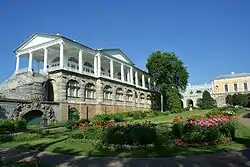 В колоннаде Камерон не просто воспроизвёл греческий ионический ордер, а скопировал любимый им ордер Эрехфейона афинского Акрополя с необычно высокой, стройной капителью. Контраст этой цитаты и нарушающей канон широкой расстановки колонн усиливает остроту сочетания дерзости и изящества, широты и утончённости. Опоясанный колоннадой остеклённый павильон, в сущности, представляет собой бельведер. По этому бельведеру, с которого открывается вид на пейзажный парк и царскосельский пруд, среди бюстов философов и полководцев древности любила прогуливаться Екатерина Великая. Полнеющая императрица не терпела лестниц, и архитектор пристроил пологий пандус, поднимающийся прямо к соединенному с галереей «висячему саду» и верхнему этажу Холодных бань, созданных Камероном по образцу древнеримских терм. Идею этой композиции, предположительно, подсказал Ш.-Л. Клериссо. Весь ансамбль был создан в 1783—1786 гг.