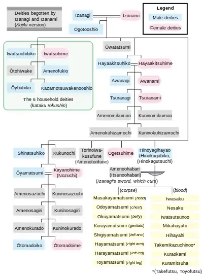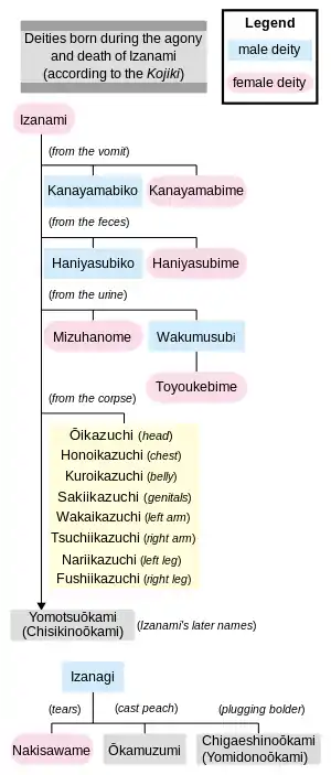 Согласно Кодзики, различные боги родились от отношений между Идзанаги и Идзанами, пока божество огня Кагуцути при рождении не опалило лоно Идзанами, что привело её к болезни, а затем и к смерти.[1][2] Изанаги, увидев, что его любимая жена умерла, в ярости обнажил меч в десять пястей, что его опоясывал, и убил своего сына Кагуцути, расчленив его на части.[3] Некоторые из богов родились из крови и отрубленных частей Кагуцути.[3] Позже Идзанаги отправился в страну Ёми-но куни (мир мёртвых), чтобы найти Идзанами, однако, когда он её нашёл, она превратилась в гниющий труп, и из её частей возникли другие боги, что привело к бегству Идзанаги в мир живых.[4] Затем Идзанаги совершил ритуал очищения (Мисоги), благодаря которому ещё родились боги.[5] Последними из них родились три самых важных бога Синтоизма: Аматэрасу-о-миками, Цукуёми-но микото, Такэхая Сусаноо-но Микото.[6]