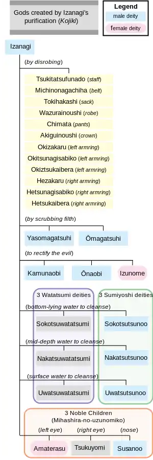 На последнем этапе ритуала очищения Идзанаги омыл свой левый глаз, из которого родилась богиня Аматэрасу-о-миками; затем омыл свой правый глаз, из которого родилось бесполое божество Цукуёми-но микото; и омыл свой нос, из которого родился бог Такэхая Сусаноо-но Микото.[5] Этим трём богам, которых вместе называют Михасира-но-удзу-но мико, Идзанаги дал наказы управлять разными сферами мира. Аматэрасу-о-миками получила ожерелье из драгоценных камней под названием Микуратанано-но-ками (яп. 御倉板挙之神) и ей было поручено управлять Такамагахарой. Цукуёми-но микото было поручено управлять ночью. Такэхая Сусаноо-но Микото было поручено управлять морем.[6]