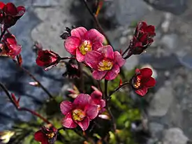 На конце стебля располагается несколько колокольчатых восходящих цветков. Цветки с двойным околоцветником, пятичленные. Чашечка тёмно-зелёная. Лепестков пять, они раздельные, округлой формы, могут быть, в зависимости от сорта, различной окраски — белые, желтоватые, розовые, различных оттенков красного[5] и фиолетового. Замечено, что имеется зависимость между высотой над уровнем моря территории, на которой выращивается растение, и интенсивностью окраски листьев и цветков: чем больше высота, чем интенсивнее становится окраска[5].