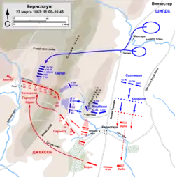 На рассвете 23 марта отряды Джексона вышли из лагеря и к 14:00 часов прошли 14 миль до Кернстауна. На холме Причардс-Хилл около Кернстауна держала позицию огайская бригада Кимбэлла. Бригада Салливана приближалась ему на помощь. Как только началась перестрелка, Кимбэлл вызвал из Винчестера бригаду Тайлера и велел ей занять высоты на правом фланге. Между тем Джексон рассудил, что атаковать Причардс-Хилл рискованно, поэтому оставил в центре «Бригаду каменной стены» и отправил бригаду Фалкерсона и бригаду Джессе Бёркса в обход правого фланга противника. Эти две бригады неожиданно наткнулись на наступающую бригаду Тайлера, и одновременно Кимбэлл двинул вперед свою бригаду, начав наступление на позиции бригады Гарнетта. Джексон надеялся удержать позицию, но уставшая и расстрелявшая все боеприпасы бригада Гарнетта начала отход, что вынудило отступить и Фалкерсона[23].