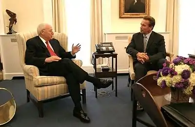 Свой первый иностранный визит в качестве губернатора Калифорнии бывший бодибилдер совершил в Израиль; во время этого визита он пожертвовал центру Симона Визенталя миллион долларов[9]. Эти шаги встретили негативную реакцию мусульманской общины Калифорнии, назвавшей «вовлечение штата в ближневосточный кризис непродуктивным».