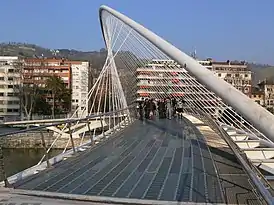 Архитектором моста является Сантьяго Калатрава, который также спроектировал аэропорт Бильбао. Мост состоит из наклонённой арки из конструкционной стали, соединяющей две платформы, к которым подходят рампы с обеих сторон реки. Изогнутый мост, замощённый стеклянными плитками, подвешен за арку на стальных кабелях. Вся конструкция выкрашена в белый цвет, как и другие творения Калатравы.