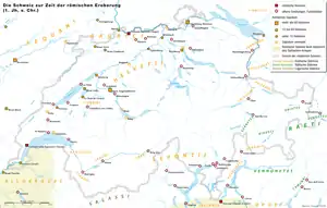 Далее, по порядку следуют части гор, обращенные к востоку и к югу; их занимают реты и винделики, области которых примыкают к областям гельветов и бойев, ибо их территории лежат вблизи равнин этих племен. Область ретов простирается до части Италии, расположенной над Вероной и Комом (между прочим, «ретийское» вино, которое, как кажется, не уступает прославленным сортам вин италийских областей, производится у подошвы Ретийских Альп), а также доходит до местностей, по которым протекает Рен; к этому племени принадлежат лепонтии и камуны. Винделики и норики занимают большую часть внешней стороны предгорья вместе с бреунами и генаунами (последние принадлежат уже к иллирийцам). Все эти племена от времени до времени совершали набеги не только на соседние части Италии, но также на страну гельветов, секванов, бойев и германцев. Ликаттии, клаутенатии и венноны являлись самыми отважными воинами среди всех винделиков, а среди ретов — рукантии и котуантии.