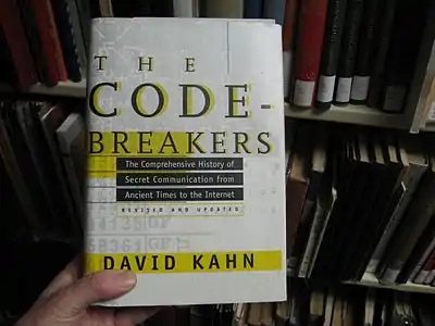 - Kahn, David (1967). The Codebreakers: The Comprehensive History of Secret Communication from Ancient Times to the Internet. Scribner (later reprinted by Macmillan, 1996). ISBN 978-0684831305.