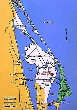 Станция ВВС США «Мыс Канаверал» (зеленый) и Космический центр имени Кеннеди (белый).