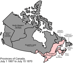 После Большой коалиции во время Шарлоттаунской и Квебекской конференций в 1864 году, а также Лондонской конференции в 1866 году, отцы Конфедерации проводят объединение трёх колоний — Соединённой Канады, Новой Шотландии и Нью-Брансуика, — приводящее по сути к созданию новой страны. Акт о Британской Северной Америке, вступивший в силу 1 июля 1867 года, создаёт доминион под названием Канада, разделённый на четыре провинции: Онтарио, Квебек, Нью-Брансуик и Новая Шотландия[47]. Цель такой организации — заглушить многонаселённый франкоязычный Квебек группой мелких англоязычных провинций с равными полномочиями. Поначалу в федерацию не входили острова Ньюфаундленд и Принца Эдуарда. Канада получила право формировать собственное правительство, не выходя из состава Британской империи, то есть фактически получила независимость.