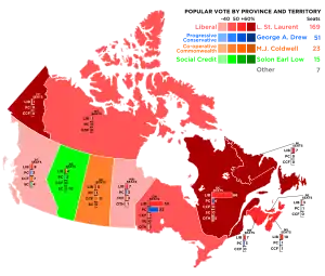 В результате выборов в парламент страны прошли Либеральная партия Канады, Прогрессивно-консервативная партия Канады, Федерация объединённого содружества и партия социального кредита Канады. Участвовали в выборах но не смогли сформировать фракцию в палате общин следующие партии: либералы-лейбористы, либералы-прогрессисты, лейбористы-прогрессисты, националисты, христианские лейбористы, locataire, антикоммунисты, социалисты-лейбористы.