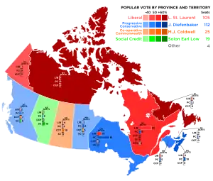 | Результат выборов | Новый премьер-министр: Джон Дифенбейкер (прогрессивно-консервативная партия) Прежний премьер-министр: Луи Сен-Лоран (либеральная партия) | ||