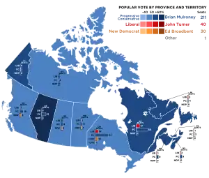 | Результат выборов | Новый премьер-министр: Брайан Малруни (прогрессивно-консервативная партия) Прежний премьер-министр: Джон Тернер (либеральная партия) | ||