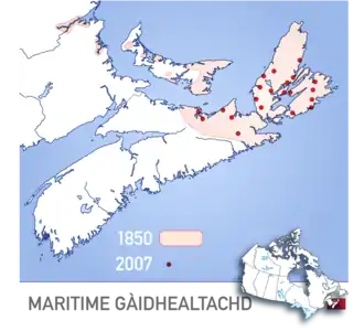 К 1850 году гэльский был третьим по числу носителей языком в британской Северной Америке после английского и французского. Считается, что на нем говорили более 200 000 североамериканцев британского происхождения[5]. Большая часть ирландского иммигрантов, говорящих на гэльском языке, смешалась с населением шотландских общин, где также говорили на гэльском, не считая ирландских поселений в Ньюфаундленде. На острове Принца Эдуарда и Кейп-Бретоне были большие районы одноязычного шотландского гэльскоязычного населения[6]. Вокруг Пикту и Антигониш на северо-востоке Новой Шотландии были общины, говорящие по-гэльски; другие общины существовали в округах (графствах) Гленгарри, Стормонт, Грей и Брюс в Онтарио; в долине Кодрой в Ньюфаундленде; в Виннипеге, Манитобе и восточном Квебеке[7].