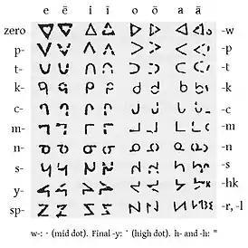 Связь между ними и слогами с передним гласным зависит от согласного в слоге. Может быть две модели: симметричные знаки (одиночный гласный, p-, t-, sp-) поворачиваются на 90 градусов против часовой стрелки, а асимметричные c-, k-, m-, n-, s-, y- поворачиваются вверх ногами. Слоги с нижне-передней гласной (-e) образуются, таким образом, из слогов с нижне-задней гласной (-a), а слоги с верхне-передней гласной (-i) получаются из слогов с верхне-задней гласной (-o).