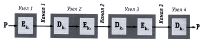 При таком способе шифрования одинаковыми ключами необходимо снабдить сопредельные узлы.
