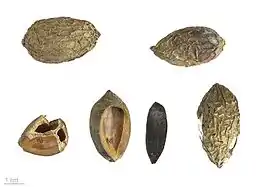 Плоды — сине-чёрные костянки, 35—60 мм длиной и 15—30 мм шириной, овальной или округлой, слегка треугольной в сечении формы, с гладкой поверхностью, в группах по 6—12. Семена коричневые, размером 35 на 20 мм.