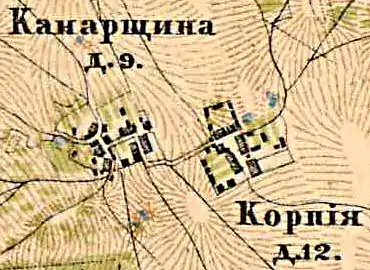 В пояснительном же тексте к этнографической карте она записана, как две деревни: Neu Kanasko (Канаршина) и Alt Kanasko (Корпия), с общим количеством жителей на 1848 год: 16 м. п., 15 ж. п., всего 31 человек[8].